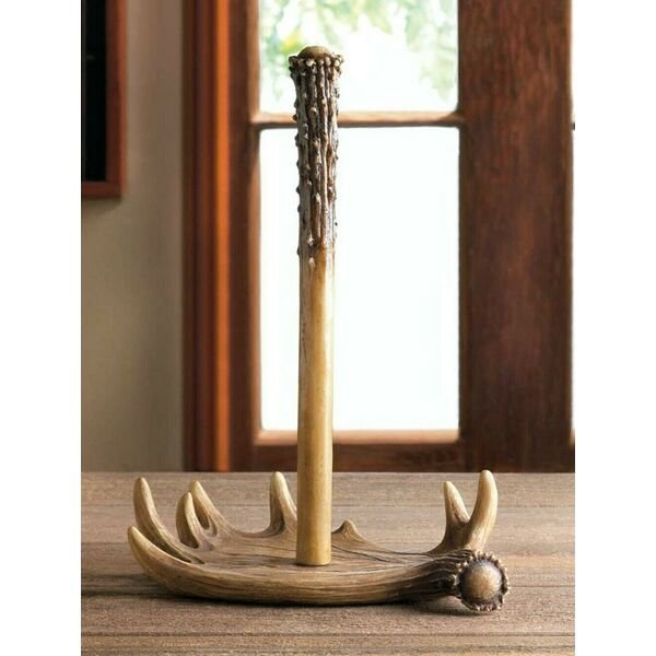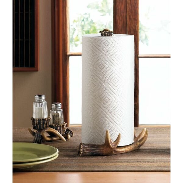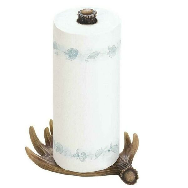 Northwoods-style paper towel stand is made from iron and polyresin and made to look like a big moose antler. Fits a standard roll of paper towels (not included). 1.2 pounds. 9.5 x 6 x 12.8 inches tall. Polyresin and iron.