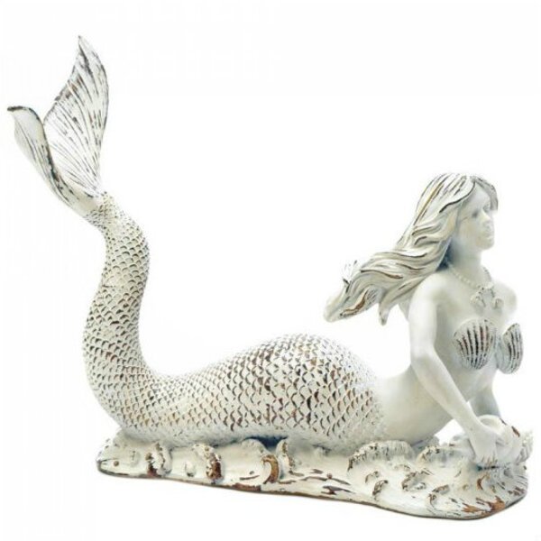 This siren of the sea is poised to hold your favorite bottle of wine in weathered style. Place this pretty mermaid on a counter or bar, and she will show off a wine bottle with her tail. Looks beautiful even without a wine bottle! 2.2 pounds. 9.5 x 4.5 x 7 inches tall. Polyresin.