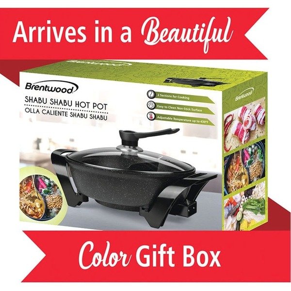 Use the powerful 1600w Brentwood SK-72BK Electric Non-Stick 6-Quart Shabu Shabu Pot with Divider to make authentic Japanese and Chinese cuisine at home. Features a convenient 2 section design, non-stick surface, cool touch handles, and a removable thermostat with adjustable temperature up to 430 F. Perfect for sharing the flavors of Shabu Shabu and Hot Pot with friends and family. General Information Manufacturer: Brentwood Appliances, Inc Manufacturer Part Number: SK-72BK Brand Name: Brentwood Product Model: SK-72BK Product Name: SK-72BK Electric Non-Stick 6-Quart Shabu Shabu Pot with Divider, Black Marketing Information: Use the powerful Brentwood SK-72BK Electric Non-Stick 6-Quart Shabu Shabu Pot with Divider to make authentic Japanese cuisine at home. Features a convenient 2 section design, non-stick surface, cool touch handles, and a removable thermostat with adjustable temperature up to 430F. 2 Section Design Non-Stick Surface Integrated Divider Cool Touch Handles Non-Slip Rubber Feet Removable Thermostat Adjustable Temperature Max Temperature: 430F Tempered Glass Lid with Vent Color: Black Power: 1600w Approval Code: cETLus Product Type: Electric Skillet Technical Information Pan Width: 17" Pan Length: 5.50" Pan Capacity: 6.61 lb Maximum Cooking Temperature: 430F (221.1C) Features: Adjustable Temperature Features: Cool Touch Handle Features: Easy Clean Features: Integrated Divider Features: Non-slip Feet Features: Non-stick Features: Removable Temperature Control Power Description Power: 1600 W Physical Characteristics Product Color: Black Product Material: Rubber Product Material: Tempered Glass Height: 12.5" Weight (Approximate): 5.50 lb Miscellaneous Certifications & Standards: cETLus Country of Origin: China Warranty Limited Warranty: 1 Year